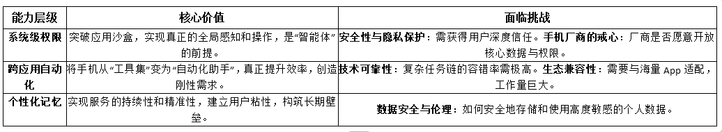 豆包手机助手的关键突破在于实现了三大能力跃迁,其核心价值与挑战如下表所示: