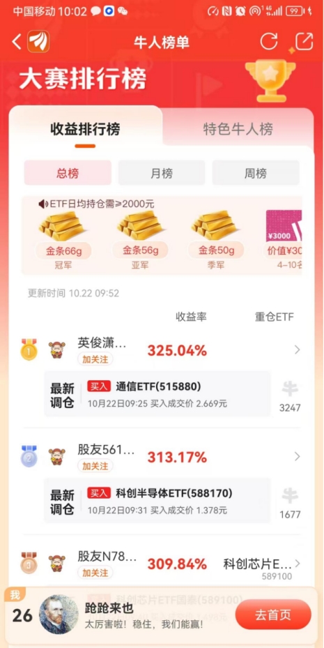 ETF大赛是有大赛牛人榜单的,榜单大神多,可以围观实时操作!利用榜单,我们可以学习牛人操作的ETF,观察买入和卖出信息;这些都是可以让我们了解热门赛道和技巧的。