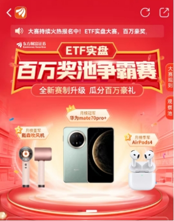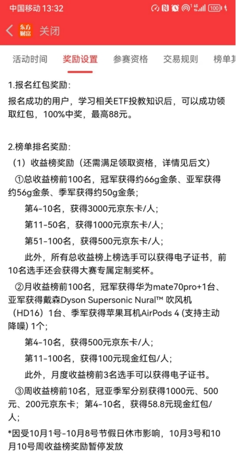 在东财本次大赛发布的时候就让我眼前一亮,给了我巨大的惊喜!赛事奖励实在是太诱人了!总榜冠军有足金66g、亚军足金56g、季军足金50克;月榜冠军华为mate70pro+一台、亚军戴森吹风机一台、季军苹果耳机AirPods4一台;周榜冠军1000元、亚军500元、季军200元京东E卡;此外排名前100名的选手都有大大小小的各种奖励!报名就有红包奖励,100%中奖!另外还有特色榜单,上榜选手都有红包奖励。总之就是奖励覆盖面广,正负收益都有机会瓜分!