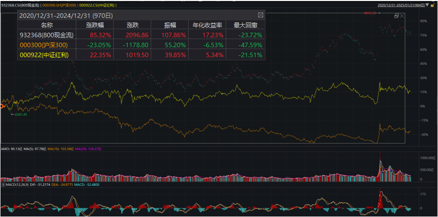 历史数据显示,自2013年基日以来,800现金流指数累计收益率达582%,同期中证红利指数收益率为283%,沪深300仅为123%。尤其在2021-2024年市场震荡下行期,沪深300下跌23.05%,中证红利上涨22.35%,而800现金流指数逆势上涨85.32%,展现极强的防御与反弹能力。