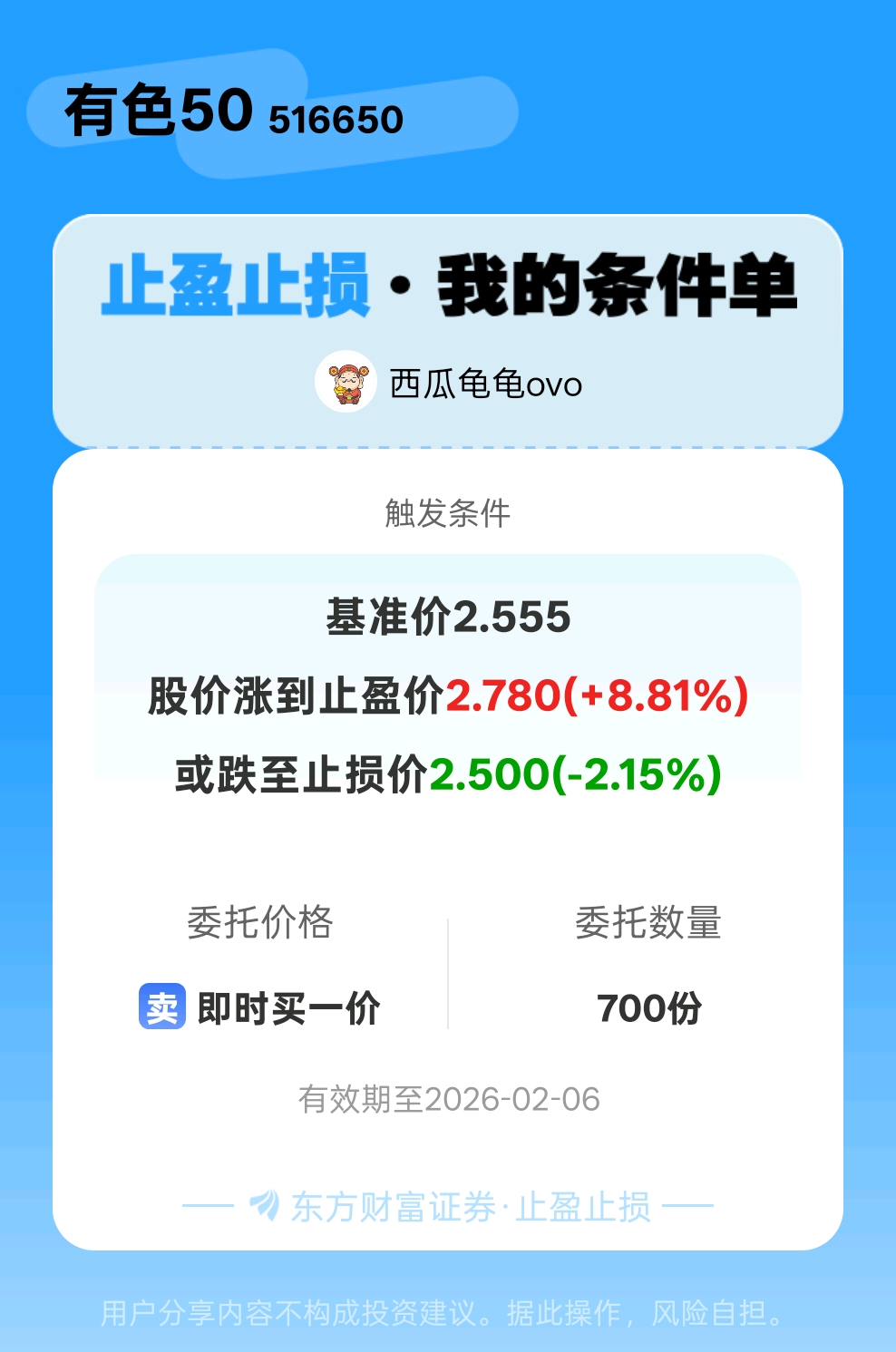 #条件单交流# #止盈止损晒单# 一位股神设置了一个止盈止损条件单,接下来就是见证奇迹的时刻~$有色50(SH516650)$