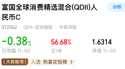 最近调整中,富国全球消费的回撤控制的还是比较小的,近1周仅回撤了1个多点,日常波动也没那么大,更能耐住性子拿长期!中长期看,近1年涨了56.68%、近2年涨了97.6%,历史净值多次创出历史新高,AC类分别收录了今年来屡创新高基金和热基定投榜。潮玩新消费、科技新消费是未来趋势,趁这只额度充足可以考虑分批布局。