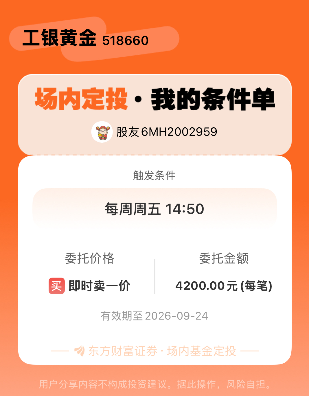 #条件单交流# #场内定投晒单# 一位股神设置了一个场内基金定投条件单,接下来就是见证奇迹的时刻~$工银黄金(SH518660)$