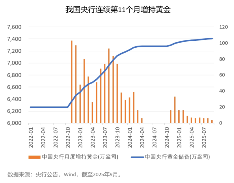 我国央行最新数据:9月末黄金储备7406万盎司(约2303吨),环比增加4万盎司(约1.24吨),为连续第11个月增持黄金。