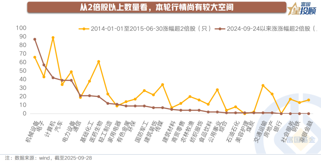 每一轮牛市的出现,除了产业逻辑、流动性配合外,一个直观的表象就是看“两倍股”的数量。2014年初至2015年中,A股涨幅超2倍股共755只,占A股的比约29%;但去年9.24以来截至2025-09-30,本轮A股涨幅超2倍的股票仅417只;从两倍股的行业分布来看,本轮行情仅机械设备、电子等个别行业超过2014年初至2015年中的那一轮牛市。以此为鉴,本轮A股行情尚有较大空间。