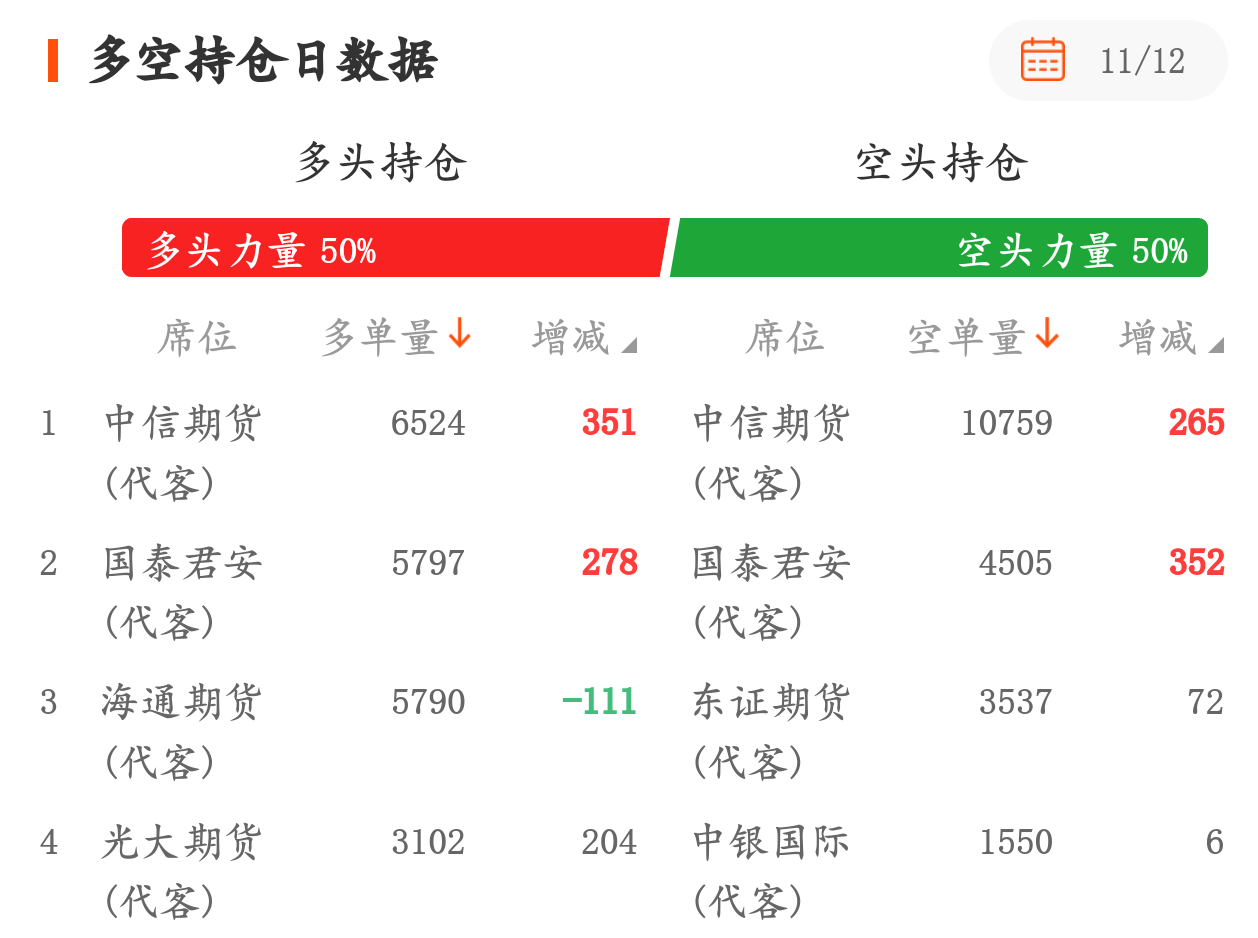 从11月期沪深300期指的数据来看,中信席位的多头加仓增持了多单351手,空头加仓增持了空单265手,对冲之后多头小幅发力进场。