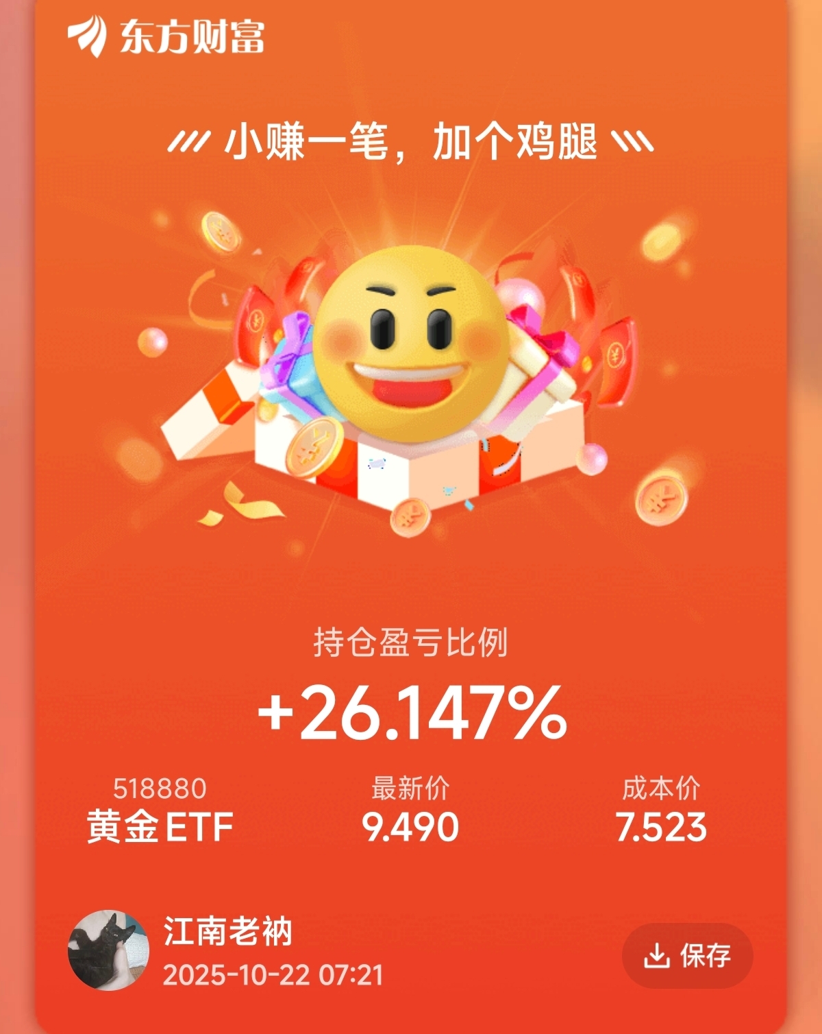 $黄金ETF(SH518880)$ 昨天高点卖了一批,今天加仓,止盈收益率有10%就行。