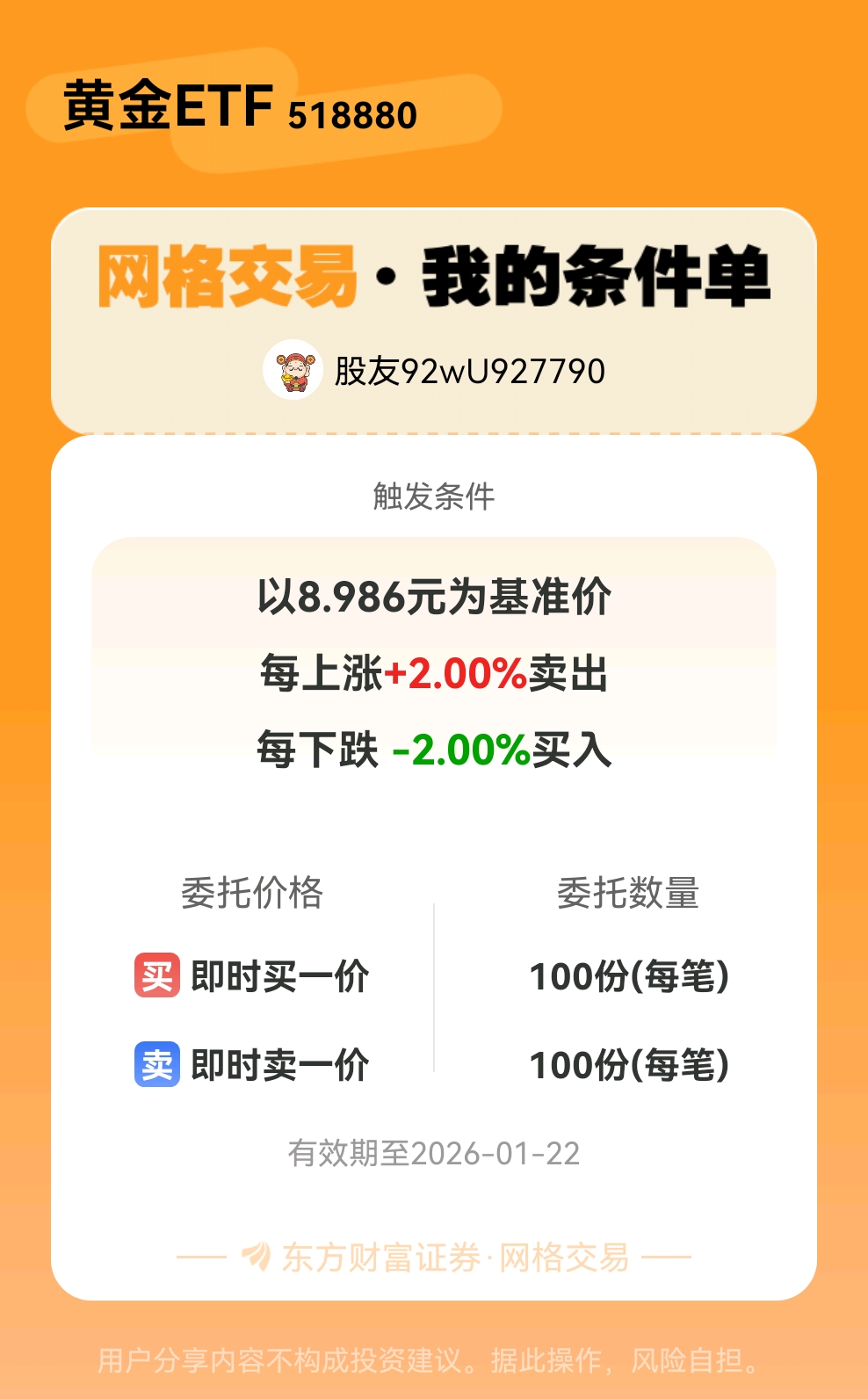 #条件单交流# #网格交易晒单# 一位股神设置了一个网格交易条件单,接下来就是见证奇迹的时刻~$黄金ETF(SH518880)$