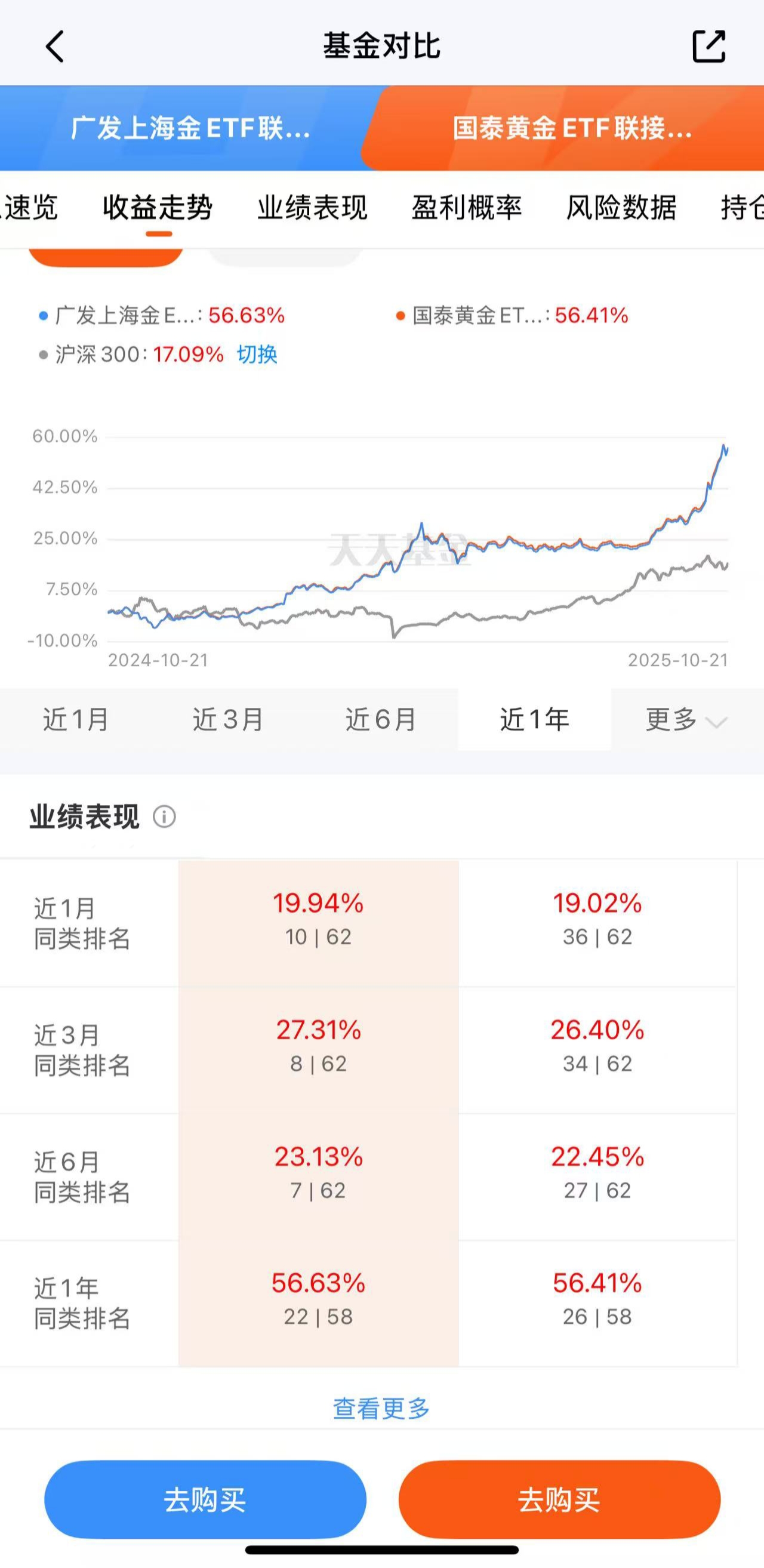 另外广发上海金近1、3个月的业绩超过国泰黄金ETF联接1个点左右,后面司机准备将国泰黄金转换为广发上海金,免得手上持基太多,分散注意力。