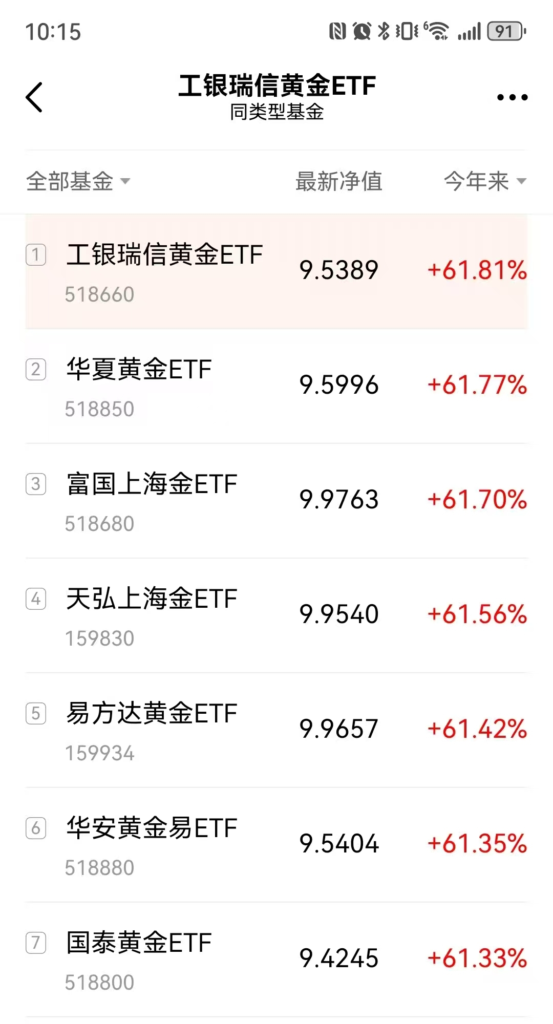 黄金目前开始高位震荡,建议控制仓位并以资产配置的理念长期持有。$黄金ETF基金(SH518660)$ 是持有费率最低的黄金ETF,合计持有期间费率只有0.2%,是其他黄金ETF的三分之一,今年以来业绩是所有黄金ETF的第一名(如图,截止10月22号),一年比其他黄金ETF多赚0.4%左右。