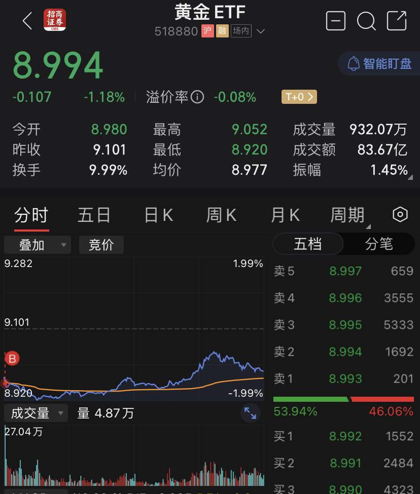 $黄金ETF(SH518880)$ 昨天走一半留一半是对的,今天低位再加了点买入,大金镯子我没赶上,黄金etf 总能喝口汤了吧,继续持有。