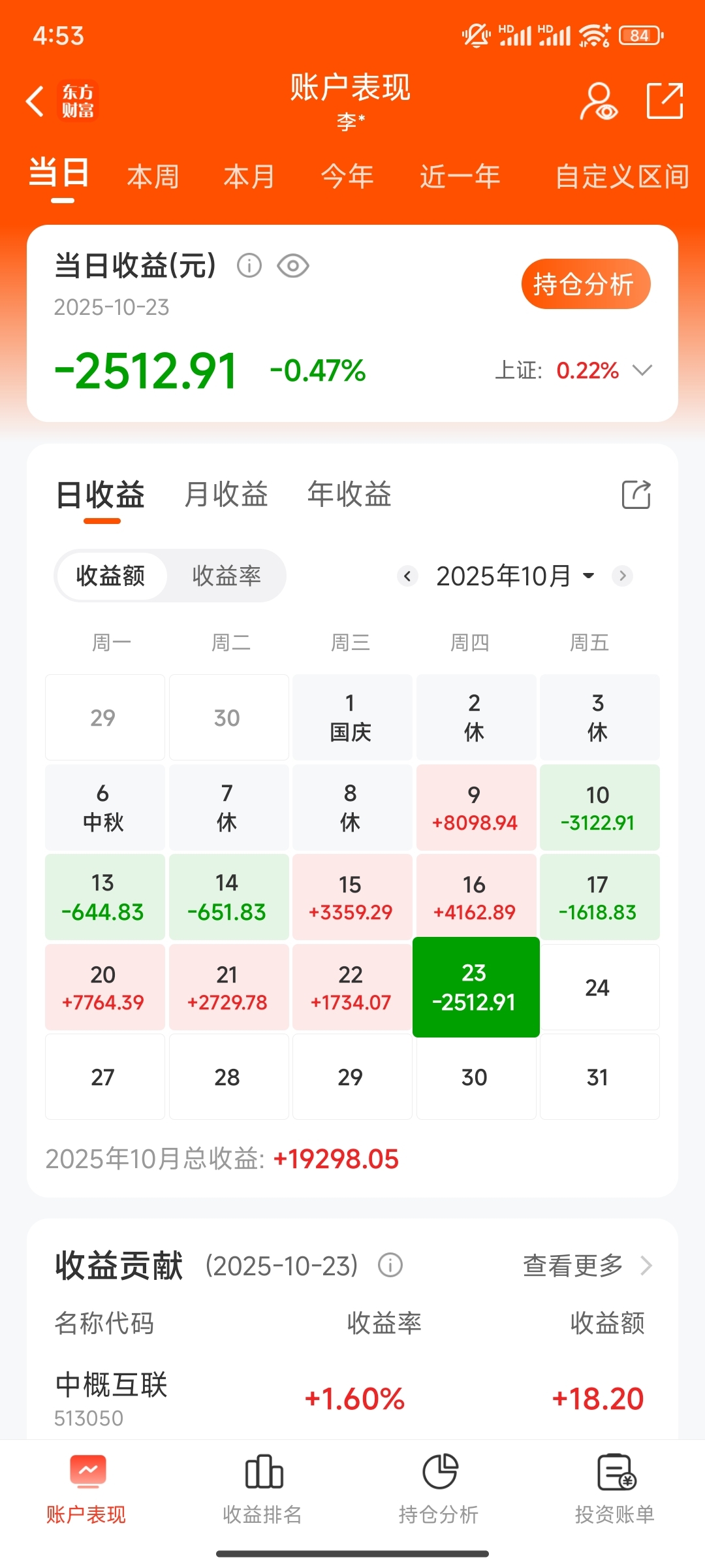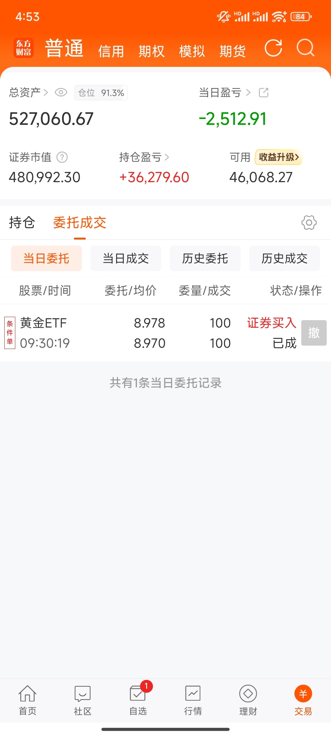 定投第188天,买入黄金100股,今日盈亏-2512,总盈亏+36279。
