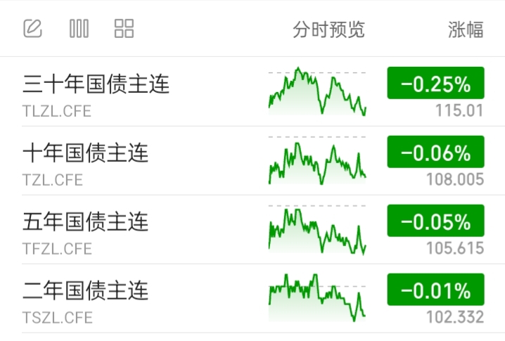 今天10、30年国债期货日K线收盘后在5日均线下,2、5年国债期货日K线收盘后在5、10、20日均线下,整体走势较弱。