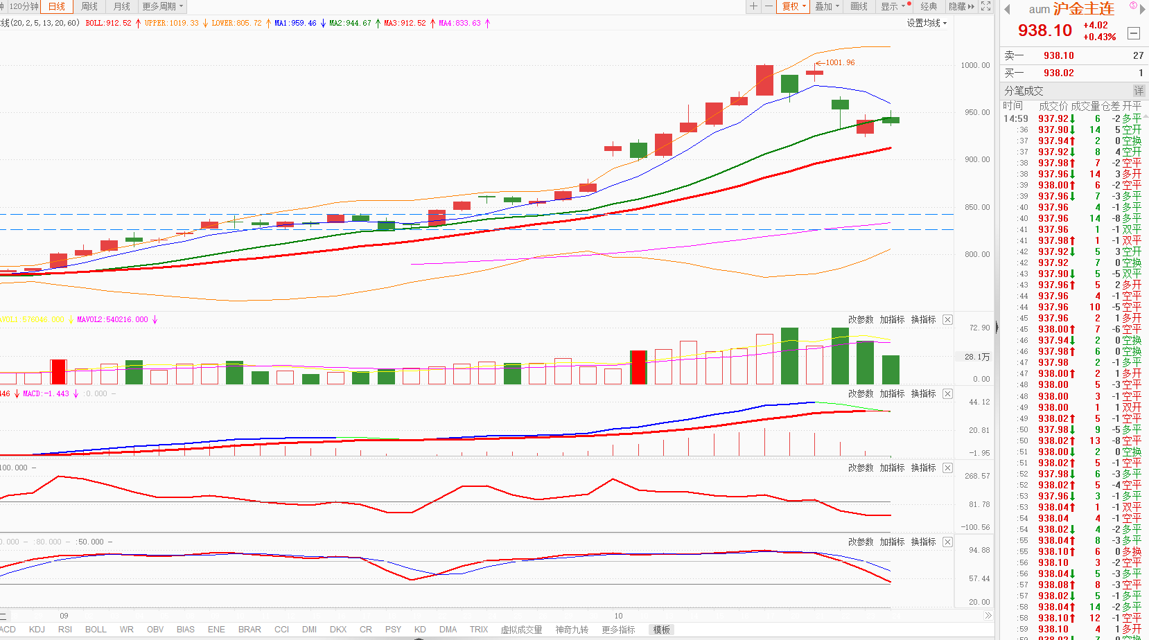 沪金主连:涨0.43%,日K线在5日均线之下。今天沪金上涨,日K线盘中震荡,又跌破10日均线,从走势上看反弹无力,多空分歧仍然较大,后市看如能守住昨日低点或再上10日均线。下周继续观察。