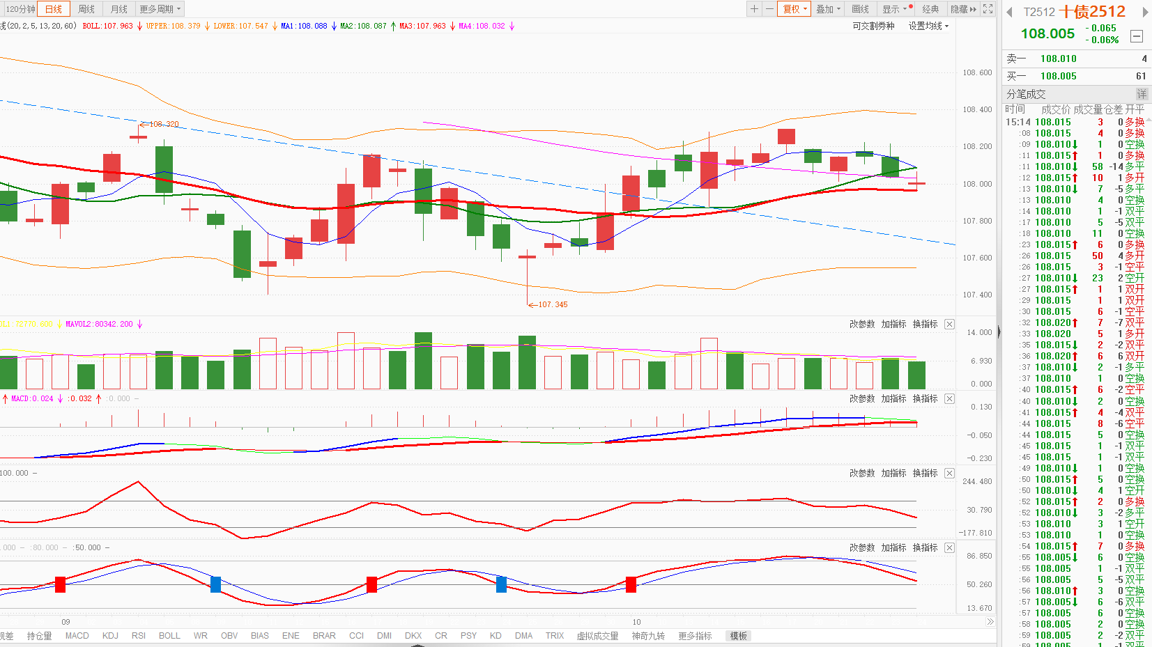 今天10年国债期货低开后横盘震荡,总体跌0.06%,日K线在5日均线之下。