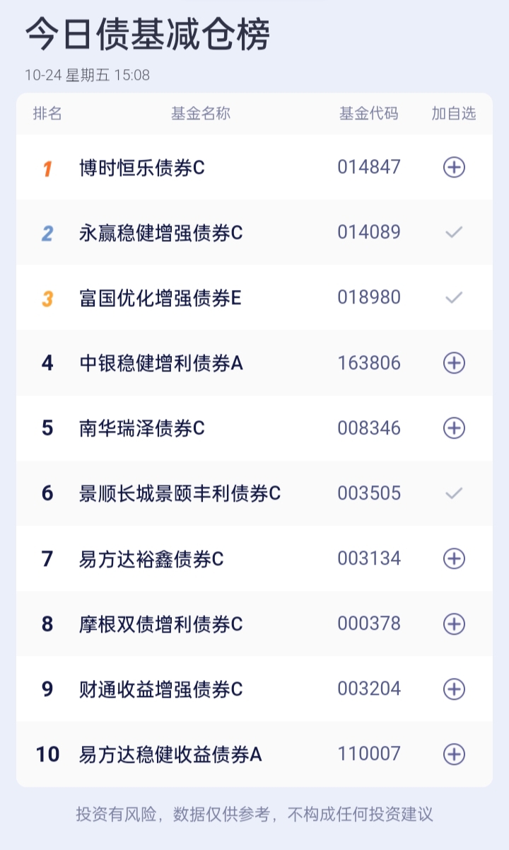 八、债券基金加、减仓榜(截止到15:00收盘)