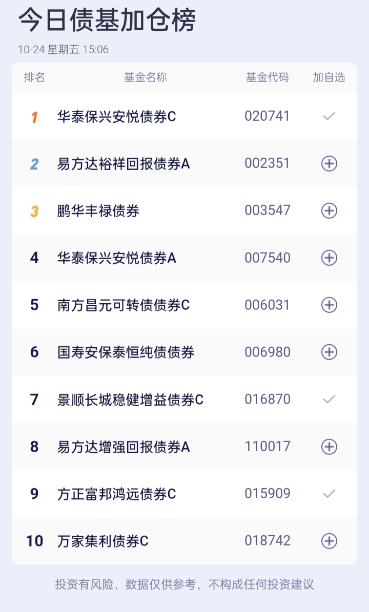 $华泰保兴安悦债券C(OTCFUND|020741)$。$南方中债7-10年国开行债券指数E(OTCFUND|013594)$。$华泰保兴安悦债券A(OTCFUND|007540)$。$永赢鑫欣混合C(OTCFUND|018603)$。$东方添益债券(OTCFUND|400030)$。$方正富邦鸿远债券C(OTCFUND|015909)$。$南方中债7-10年国开行债券指数A(OTCFUND|006961)$。$易方达增强回报债券A(OTCFUND|110017)$。$博时恒乐债券C(OTCFUND|014847)$。$国泰惠丰纯债债券A(OTCFUND|007214)$