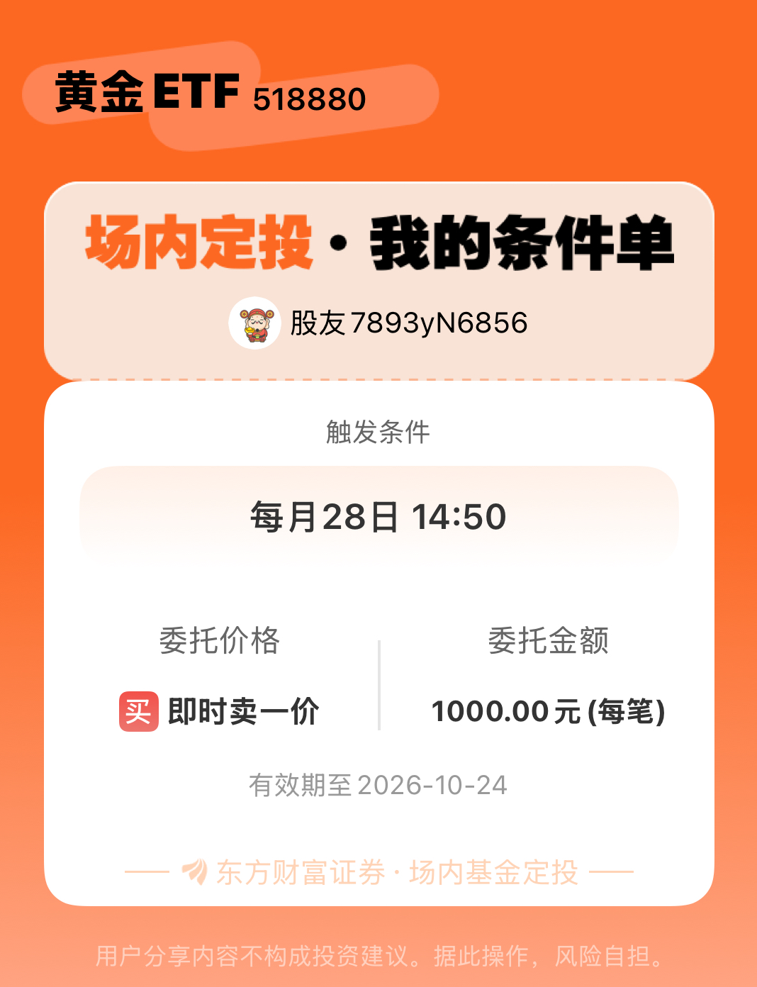#条件单交流# #场内定投晒单# 一位股神设置了一个场内基金定投条件单,接下来就是见证奇迹的时刻~$黄金ETF(SH518880)$
