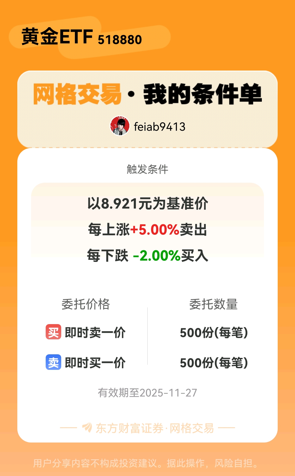 #条件单交流# #网格交易晒单# 一位股神设置了一个网格交易条件单,接下来就是见证奇迹的时刻~$黄金ETF(SH518880)$