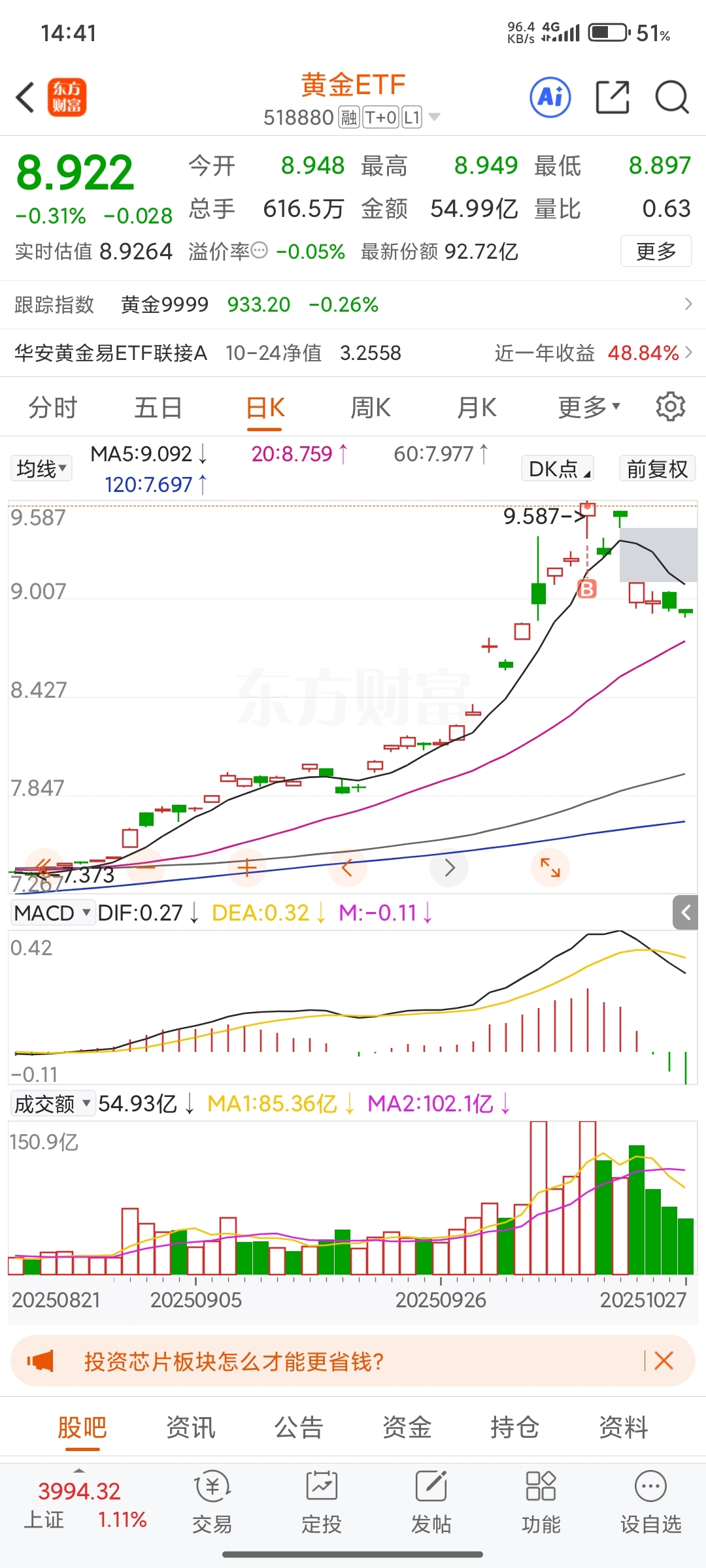 $黄金ETF(SH518880)$ 能不能别跌了,我是真买了