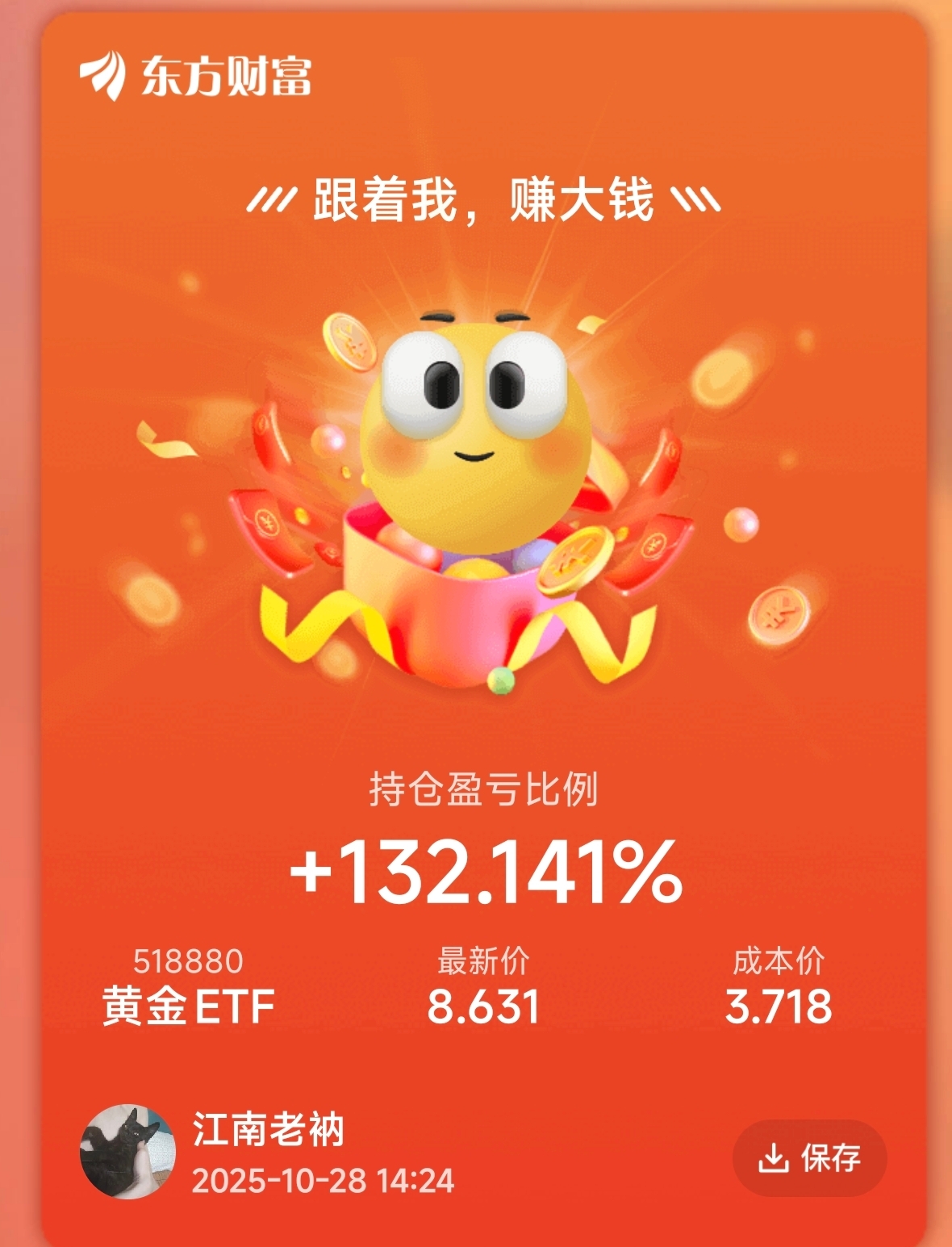 $黄金ETF(SH518880)$ 拿了近两个月,陆陆续续卖了,今天卖了最后一笔留了5万底仓当余额宝使用。当初买只是为了抵御外部风险,完全没想到后面会一路大涨。感谢在A股吃S的期间,有它帮助弥补一些亏损。