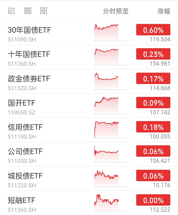 信用债ETF、公司债ETF、城投债ETF,代表信用债基。全部上涨