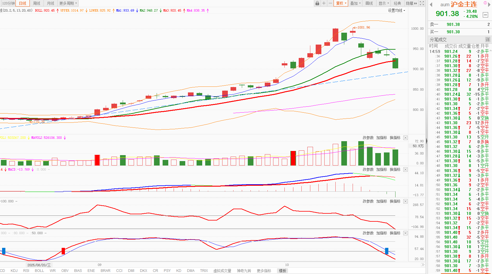 沪金主连:跌4.20%,日K线在5日均线之下。今天沪金大跌 ,日K线跌破20日均线,向上升趋势线靠拢,从技术指标看也接近低位,后市随时可能出现技术性反弹,继续观察。