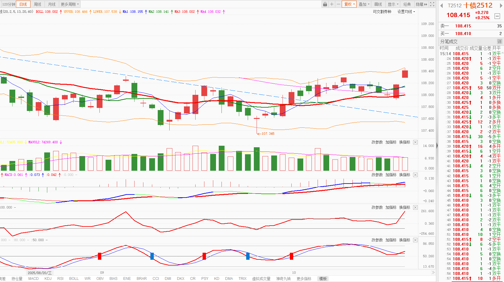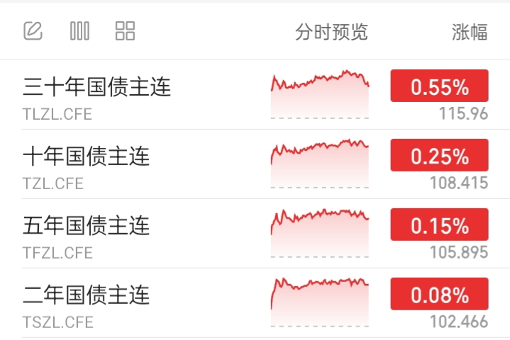今天国债期货日K线收盘后全部在5日均线之上,整体高开高走,走势较强。