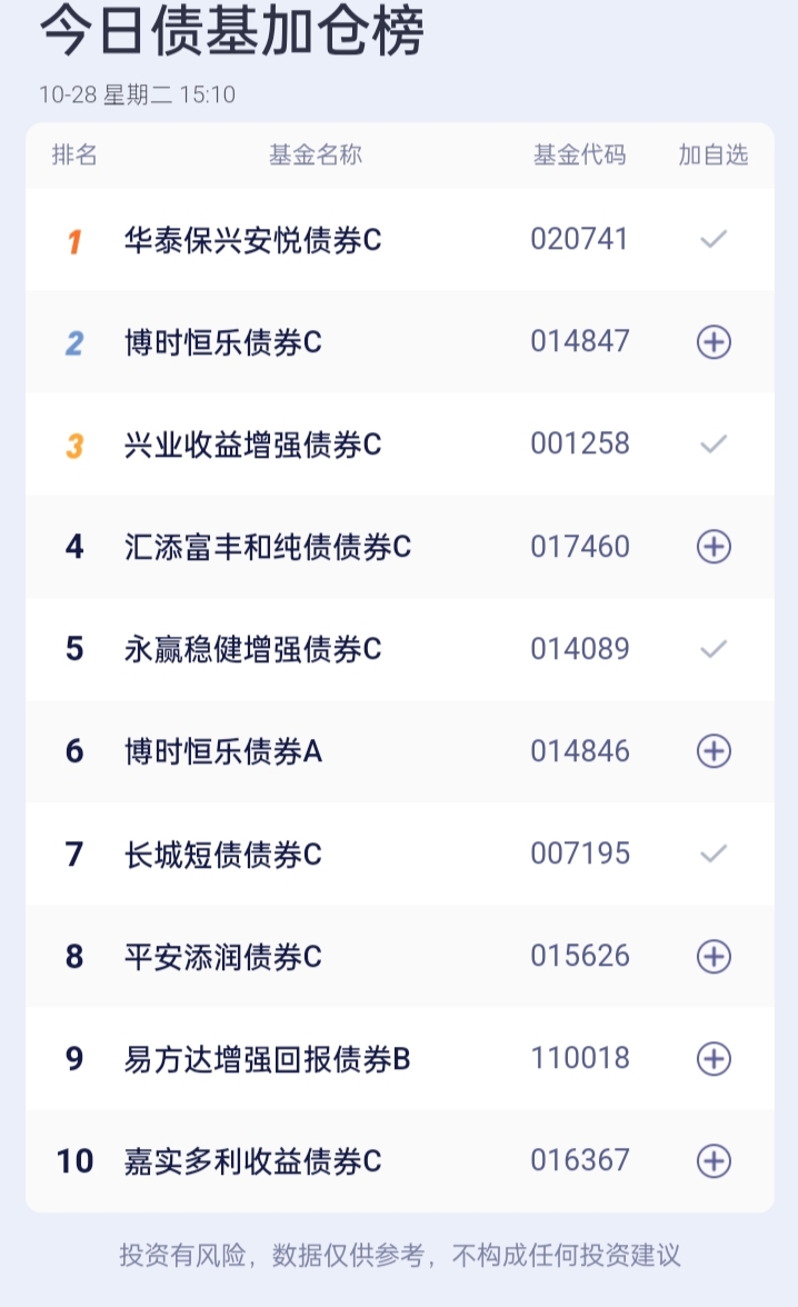$华泰保兴安悦债券C(OTCFUND|020741)$。$南方中债7-10年国开行债券指数E(OTCFUND|013594)$。$华泰保兴安悦债券A(OTCFUND|007540)$。$永赢鑫欣混合C(OTCFUND|018603)$。$东方添益债券(OTCFUND|400030)$。$方正富邦鸿远债券C(OTCFUND|015909)$。$南方中债7-10年国开行债券指数A(OTCFUND|006961)$。$易方达增强回报债券A(OTCFUND|110017)$。$博时恒乐债券C(OTCFUND|014847)$。$国泰惠丰纯债债券A(OTCFUND|007214)$