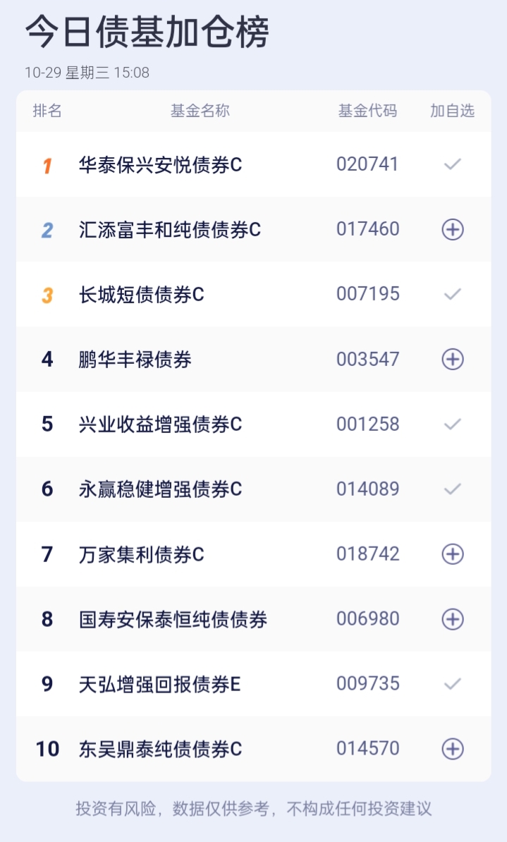 $华泰保兴安悦债券C(OTCFUND|020741)$。$南方中债7-10年国开行债券指数E(OTCFUND|013594)$。$华泰保兴安悦债券A(OTCFUND|007540)$。$永赢鑫欣混合C(OTCFUND|018603)$。$东方添益债券(OTCFUND|400030)$。$方正富邦鸿远债券C(OTCFUND|015909)$。$南方中债7-10年国开行债券指数A(OTCFUND|006961)$。$易方达增强回报债券A(OTCFUND|110017)$。$博时恒乐债券C(OTCFUND|014847)$。$国泰惠丰纯债债券A(OTCFUND|007214)$