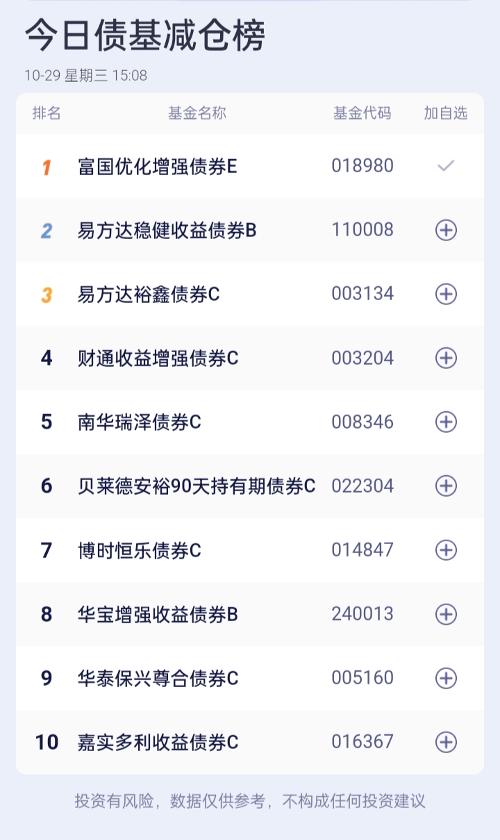 八、债券基金加、减仓榜(截止到15:00收盘)