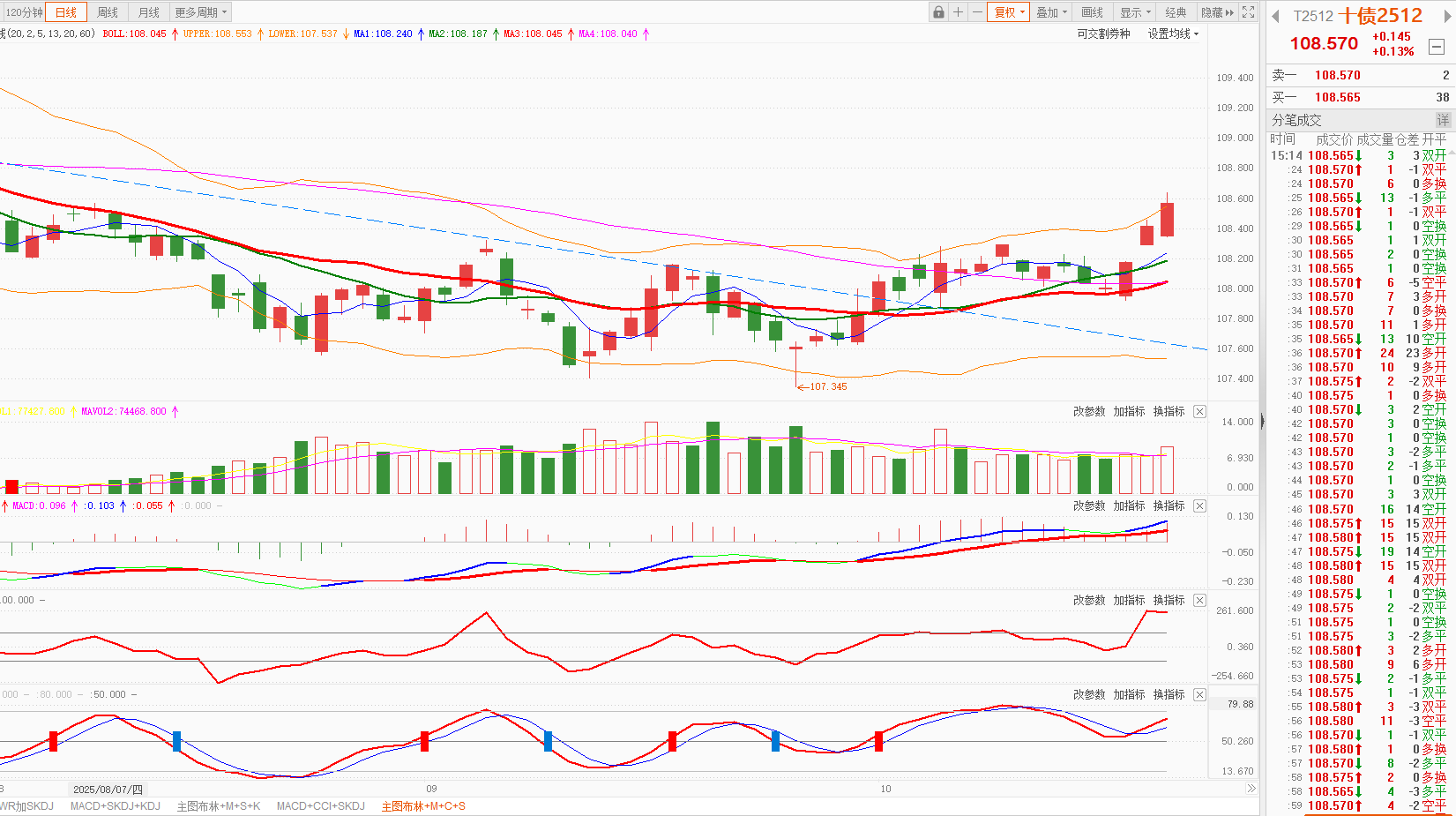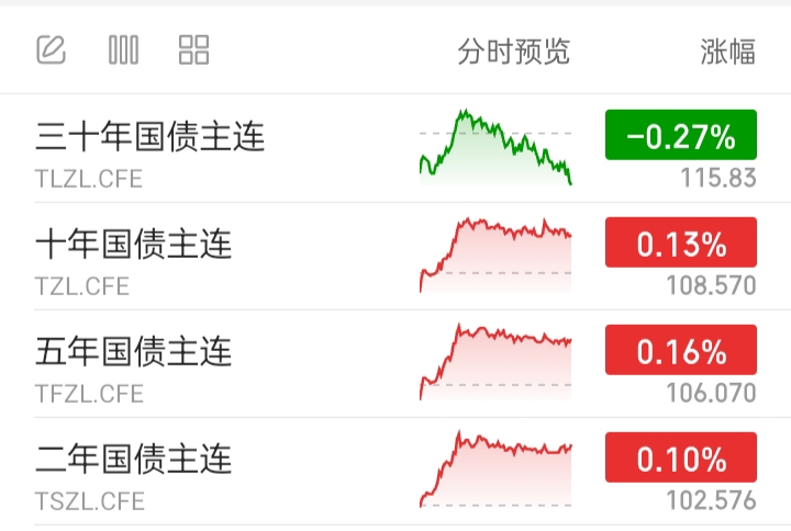 今天国债期货日K线收盘后全部在5日均线之上,整体低开高走,30年国债期货受股市上涨压制,低开后冲高回落,但总体走势较强。