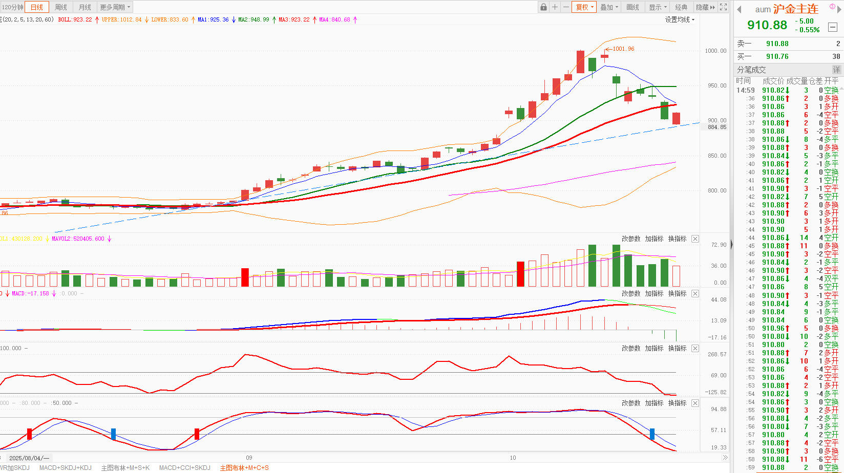 沪金主连:跌0.55%,日K线在5日均线之下。今天沪金下跌 ,日K线在探低前期上升趋势线后回升,目前技术指标已达低位,整体跌幅也不小,后面随时可能出现技术性反弹,国际金价3900点附近应该有一定的支撑,配置型资金或轻仓的可逢低买入。