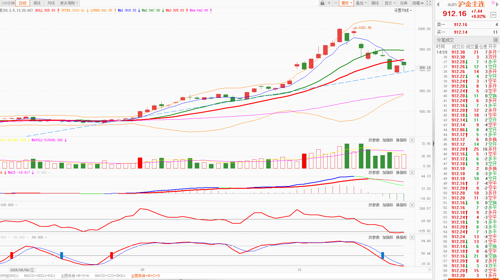 沪金主连:涨0.82%,日K线在5日均线之下。今天沪金上涨 ,日K线高开低走,在探低上升趋势线后回升,后市看能否进一步回升或守住上升趋势线不破。