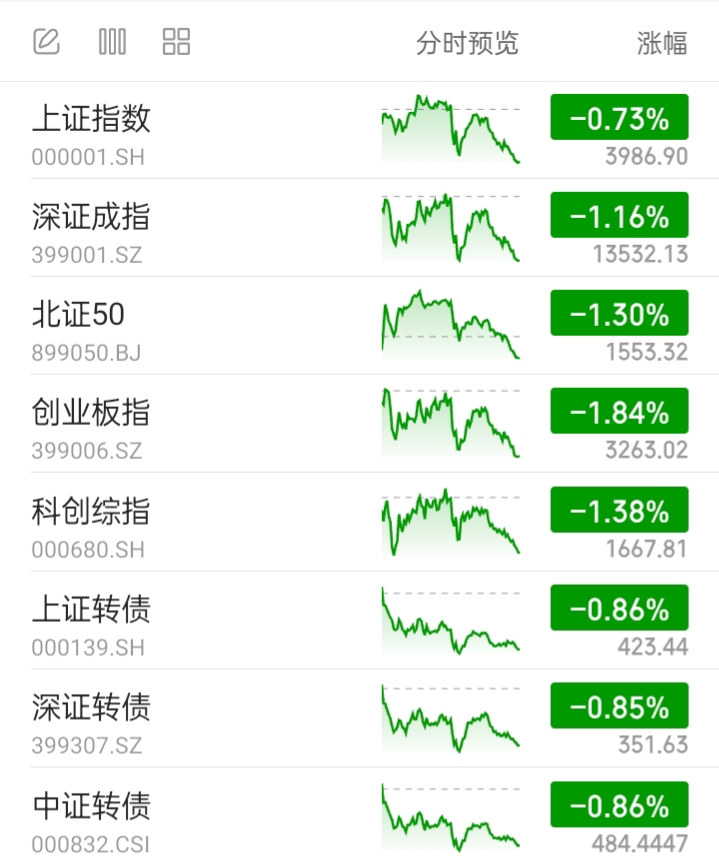 A股市场重要指数:全部下跌。今天偏股混基可能下跌