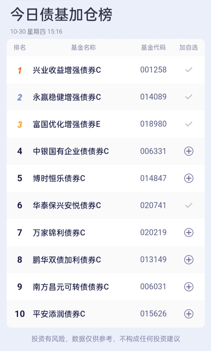 $华泰保兴安悦债券C(OTCFUND|020741)$。$南方中债7-10年国开行债券指数E(OTCFUND|013594)$。$华泰保兴安悦债券A(OTCFUND|007540)$。$永赢鑫欣混合C(OTCFUND|018603)$。$东方添益债券(OTCFUND|400030)$。$方正富邦鸿远债券C(OTCFUND|015909)$。$南方中债7-10年国开行债券指数A(OTCFUND|006961)$。$易方达增强回报债券A(OTCFUND|110017)$。$博时恒乐债券C(OTCFUND|014847)$。$国泰惠丰纯债债券A(OTCFUND|007214)$