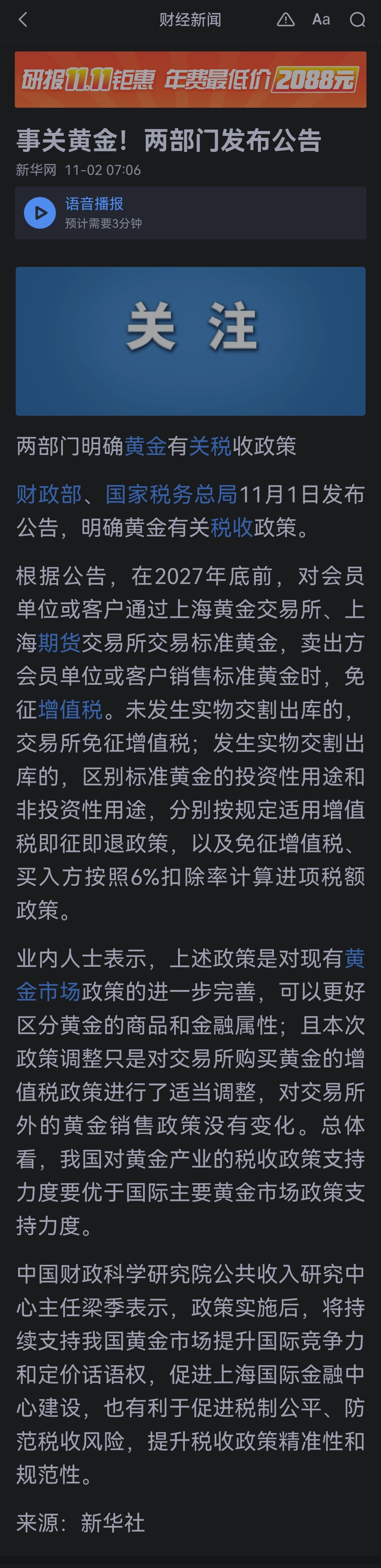 随着体量及增长巨大,上海金交所合约价格走势,要逐渐走出自己的行情走势,不能永远跟在随纽约黄金期货,伦敦现货后面走,这是个重要改变的政策准备 //@黄金大猫咪祝融 :中国财政科学研究院公共收入研究中心主任梁季表示,政策实施后,将持续支持我国黄金市场提升国际竞争力和定价话语权,促进上海国际金融中心建设,也有利于促进税制公平、防范税收风险,提升税收政策精准性和规范性。