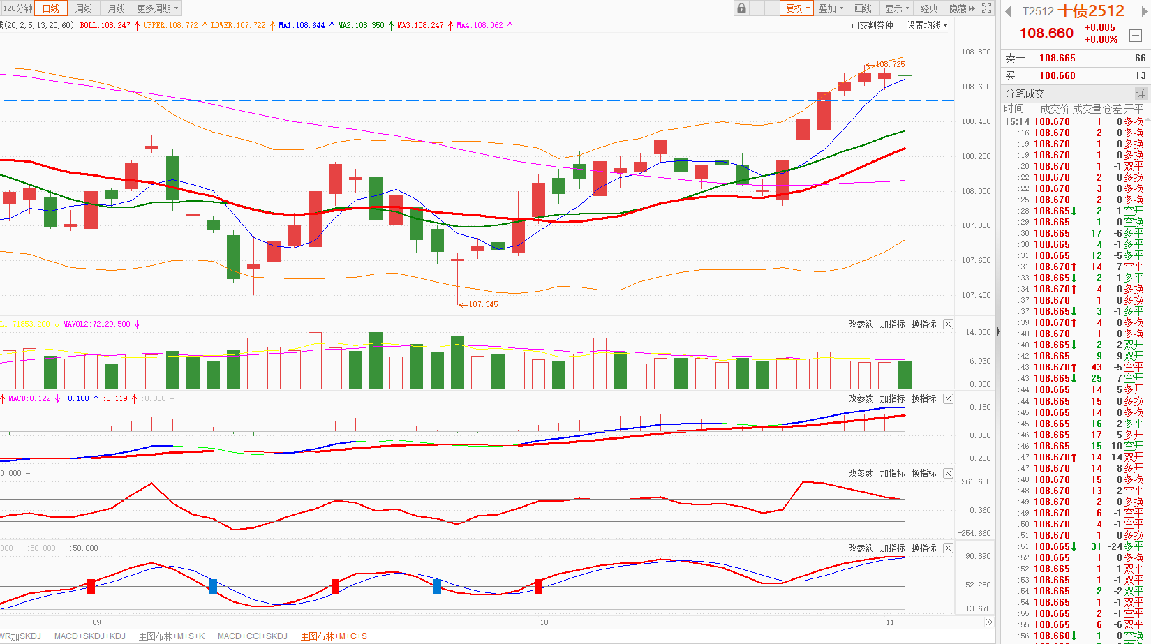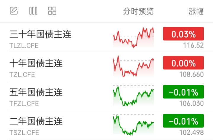 今天2、5年国债期货日K线收盘后在5日均线之下,10、30年国债期货日K线收盘后在5日均线之上,整体走势先弱后强。