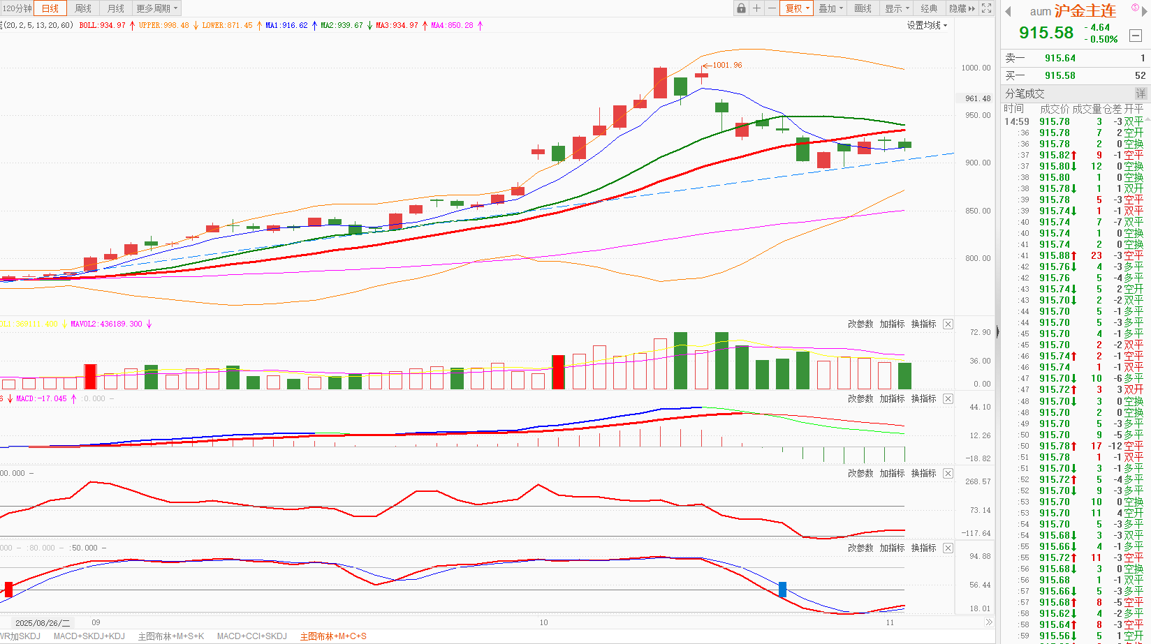 沪金主连:跌0.50%,日K线在5日均线之下。今天沪金下跌,日K线继续在5日均线附近震荡,目前处于小幅横盘震荡状态,后市可能需要打破平衡,做出方向选择或扩大震荡区间,看是向下跌破上升趋势线的支撑或向上突破10、20日均线处压力。