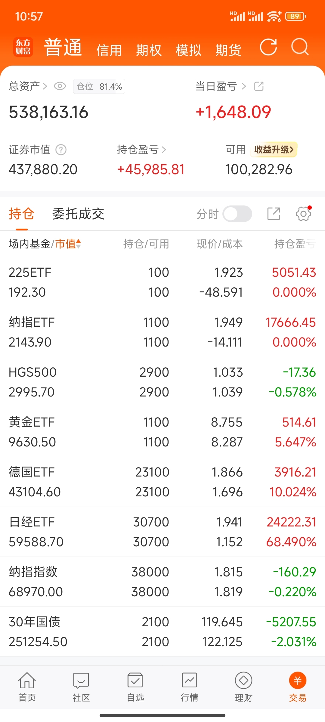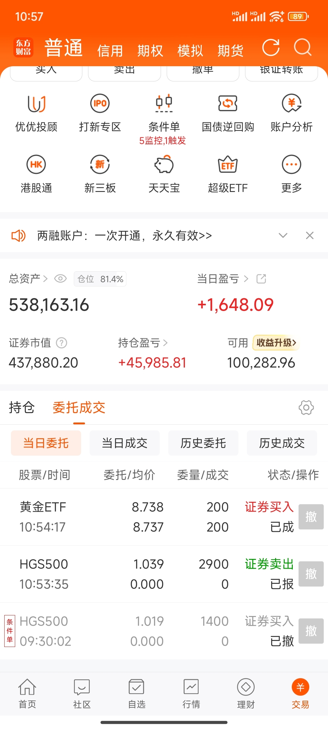 定投第202天,买入黄金200股,今日盈亏+1648,总盈亏+45985。