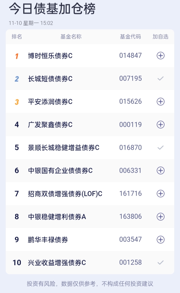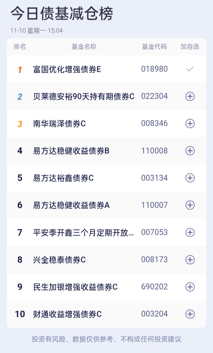 八、债券基金加、减仓榜(截止到15:00收盘)