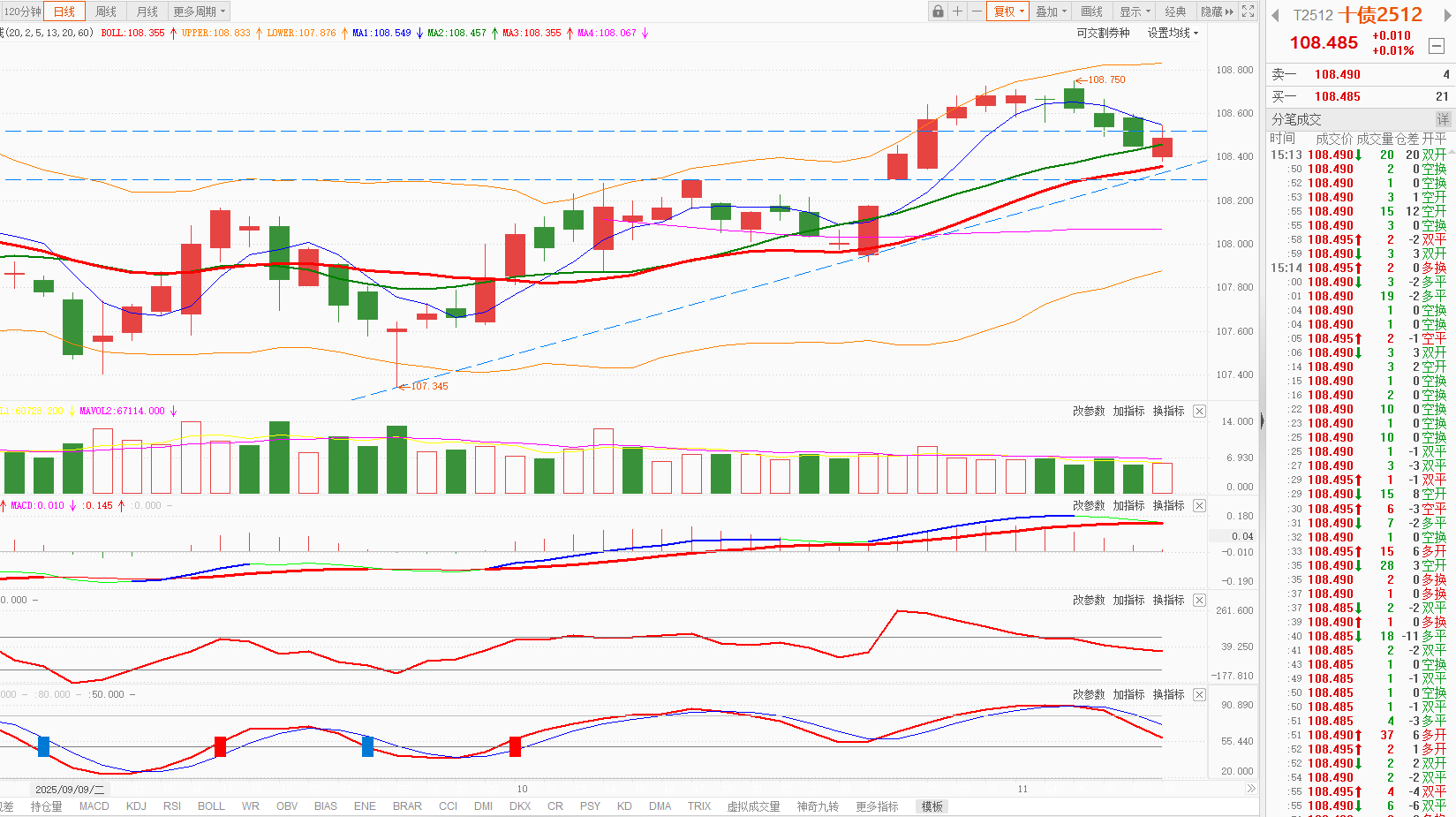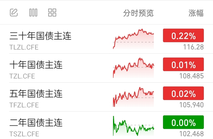 今天2、5、10国债期货日K线收盘后在5日均线之下,10国债期货日K线收盘后在5日均线之上,整体低开高走,走势偏强。