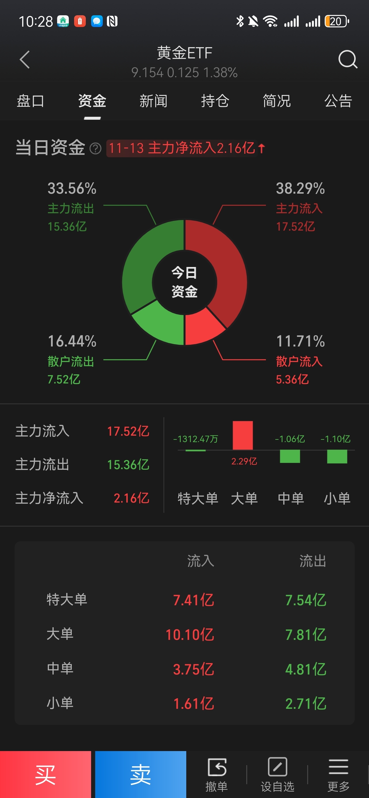 $黄金ETF(SH518880)$ 10月22暴跌以来,难得一天主力净流入