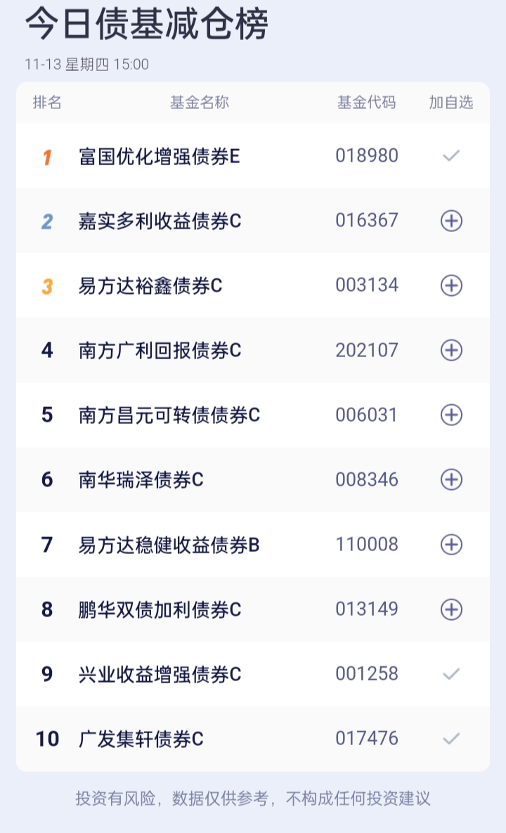 八、债券基金加、减仓榜(截止到15:00收盘)