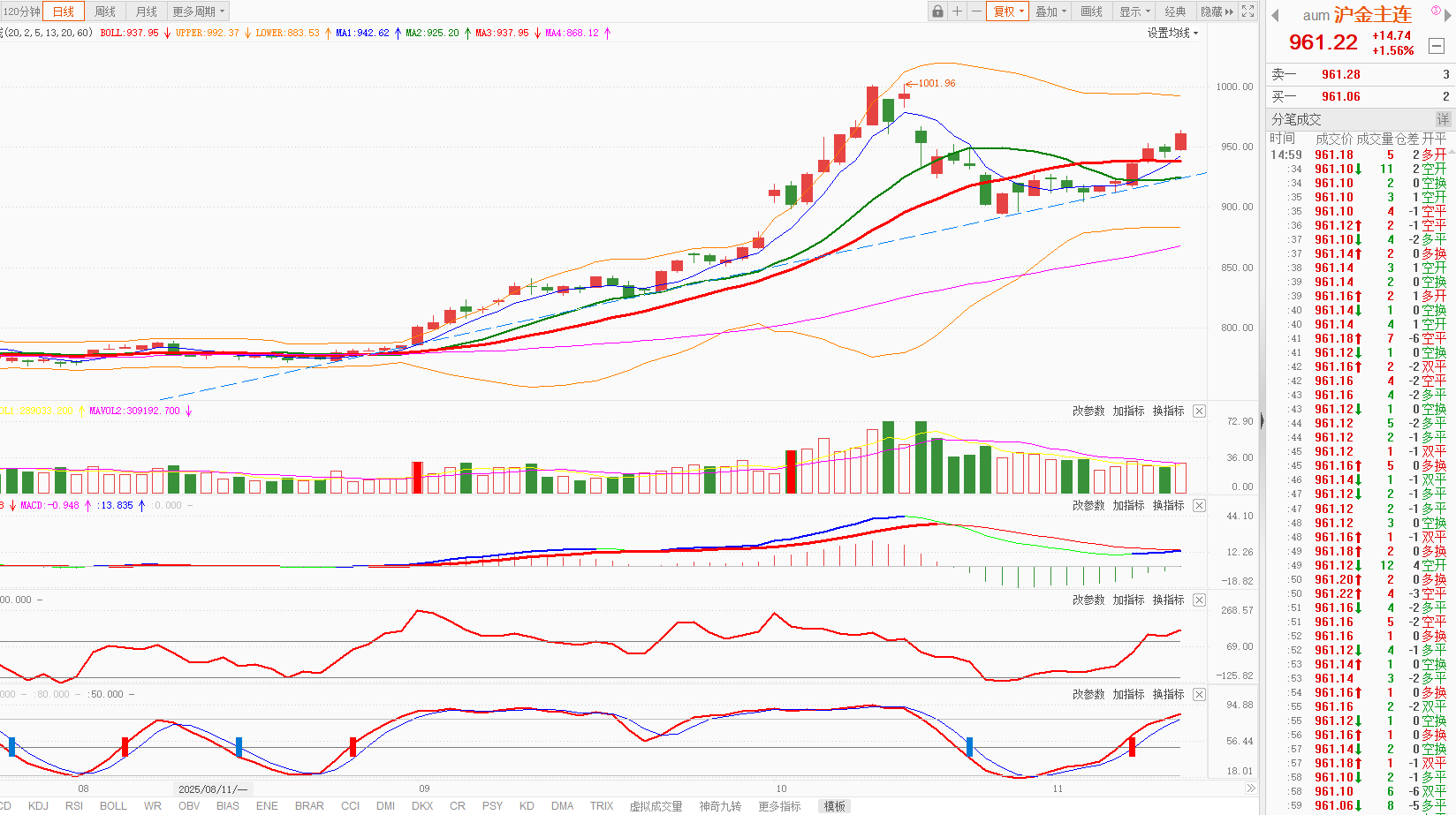 沪金主连:涨1.56%,日K线在5日均线之上。今天沪金大涨,5日均线上穿20日均线,且继续上升,后市可能继续震荡上行。可持基观望或逢低适量买入。