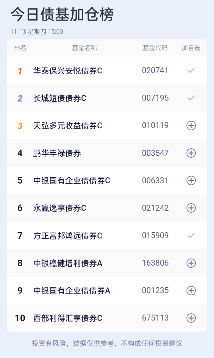 $华泰保兴安悦债券C(OTCFUND|020741)$。$易方达增强回报债券A(OTCFUND|110017)$。$华泰保兴安悦债券A(OTCFUND|007540)$。$永赢稳健增强债券C(OTCFUND|014089)$。$东方添益债券(OTCFUND|400030)$。$方正富邦鸿远债券C(OTCFUND|015909)$。$南方中债7-10年国开行债券指数E(OTCFUND|013594)$。$富国优化增强债券E(OTCFUND|018980)$。$博时恒乐债券C(OTCFUND|014847)$ 。$国泰惠丰纯债债券A(OTCFUND|007214)$
