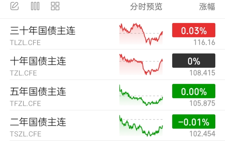 近期债市整体处于震荡格局,今天股市大跌,债市也没有大的起色,10、30年国债期货日K线都到了近期上升走势线和20日均线附近,再往下就可能破位,快到了该选择方向的时候,看下周是往下还是向上。