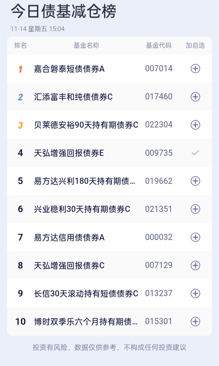 八、债券基金加、减仓榜(截止到15:00收盘)