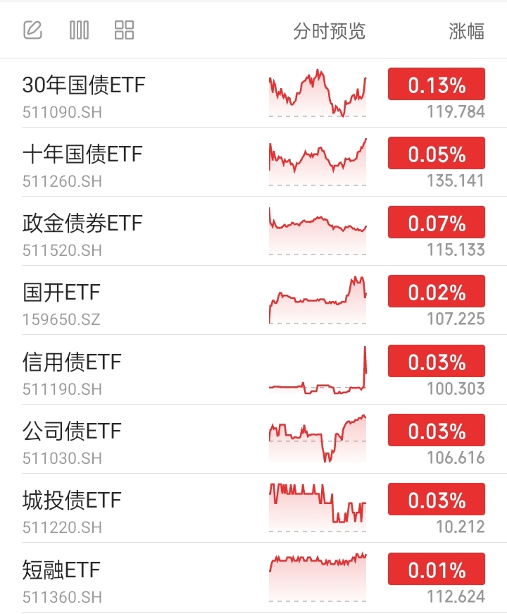 信用债ETF、公司债ETF、城投债ETF,代表信用债基。全部上涨