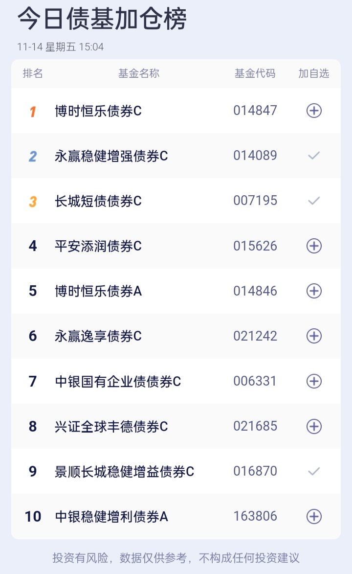 $华泰保兴安悦债券C(OTCFUND|020741)$。$易方达增强回报债券A(OTCFUND|110017)$。$华泰保兴安悦债券A(OTCFUND|007540)$。$永赢稳健增强债券C(OTCFUND|014089)$。$东方添益债券(OTCFUND|400030)$。$方正富邦鸿远债券C(OTCFUND|015909)$。$南方中债7-10年国开行债券指数E(OTCFUND|013594)$。$富国优化增强债券E(OTCFUND|018980)$。$博时恒乐债券C(OTCFUND|014847)$ 。$国泰惠丰纯债债券A(OTCFUND|007214)$